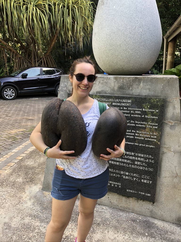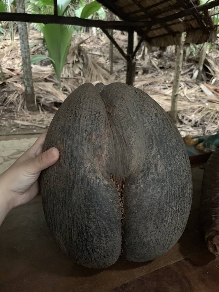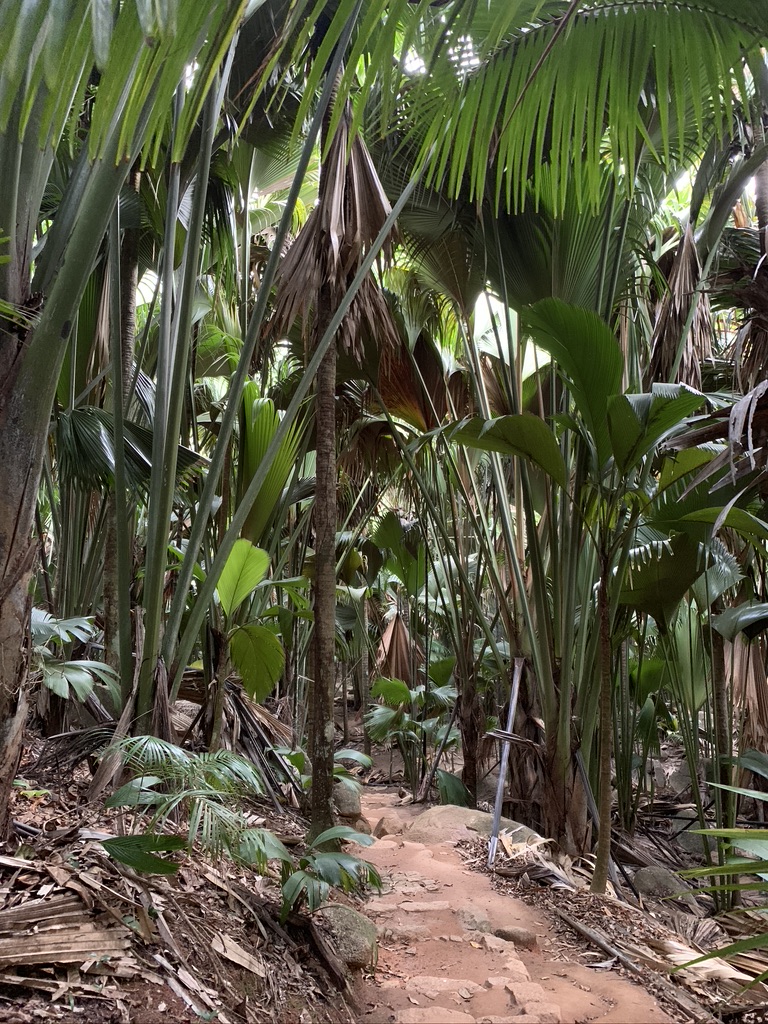 Ritornando a noi… Una volta recuperata la macchina ci dirigemmo proprio verso la Vallée de Mai, patrimonio mondiale dell’UNESCO dal 1983. Il “coco de mer” è l’emblema delle Seychelles (lo timbrano anche sul passaporto all’arrivo e alla partenza), unico luogo in cui cresce, ed è famoso per la sua forma arrotondata, per cui viene chiamato anche “coco fesse” (cocco sedere). Questo frutto ha il primato di essere il più pesante al mondo, può raggiungere anche i 40 kg. Purtroppo, essendo molto raro è anche molto ricercato, infatti è sulla lista rossa delle specie di piante in via di estinzione a causa del bracconaggio.